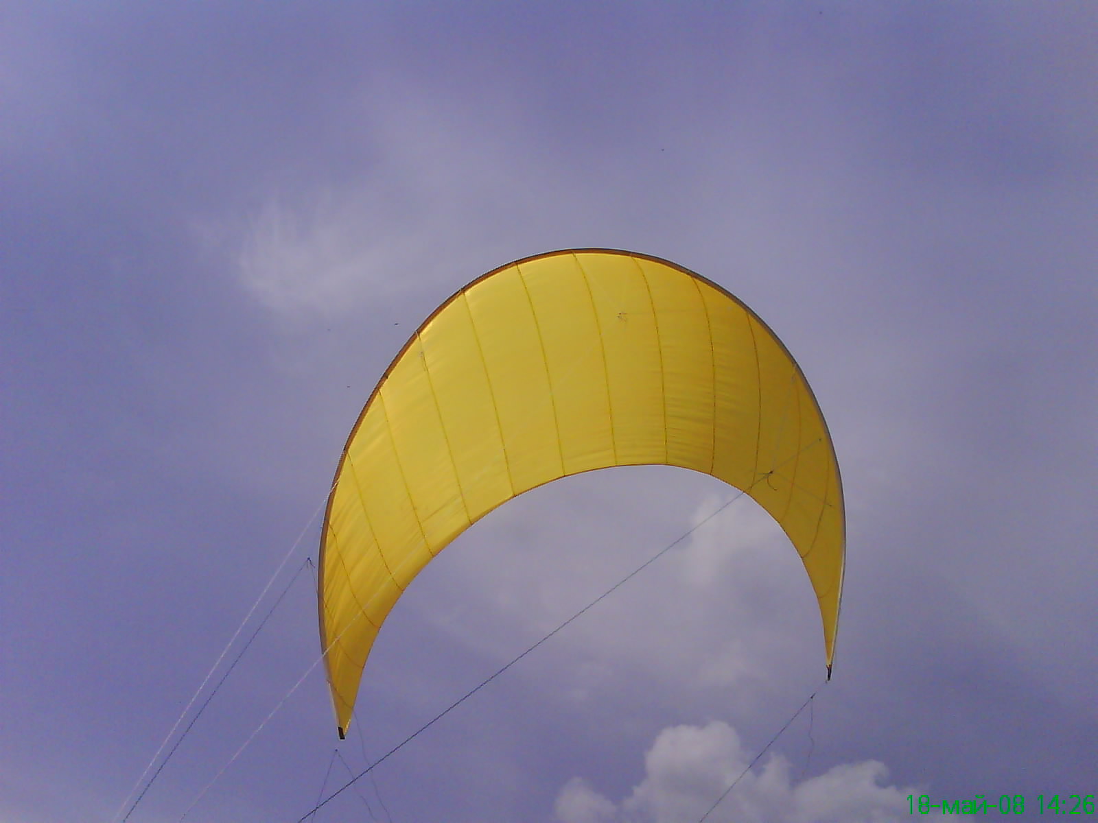 Выкладываю фотки запуска 18.05.2008. На одной фотке немного трапеция видна. А куда бы выложить видео? На видео очень хорошо видно, как при порыве ветра на развороте лопают две стропы и каркас сгибается почти под прямым углом. Хорошо, что дюраль - выровнял об колено. В этот день ветер был порывистый от 6 до 10 м/с. Проэкт выложу завтра, забыл дома.