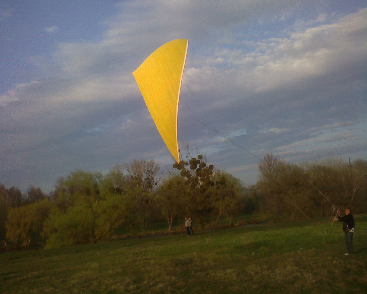 Выкладываю фотки запуска 18.05.2008. На одной фотке немного трапеция видна. А куда бы выложить видео? На видео очень хорошо видно, как при порыве ветра на развороте лопают две стропы и каркас сгибается почти под прямым углом. Хорошо, что дюраль - выровнял об колено. В этот день ветер был порывистый от 6 до 10 м/с. Проэкт выложу завтра, забыл дома.