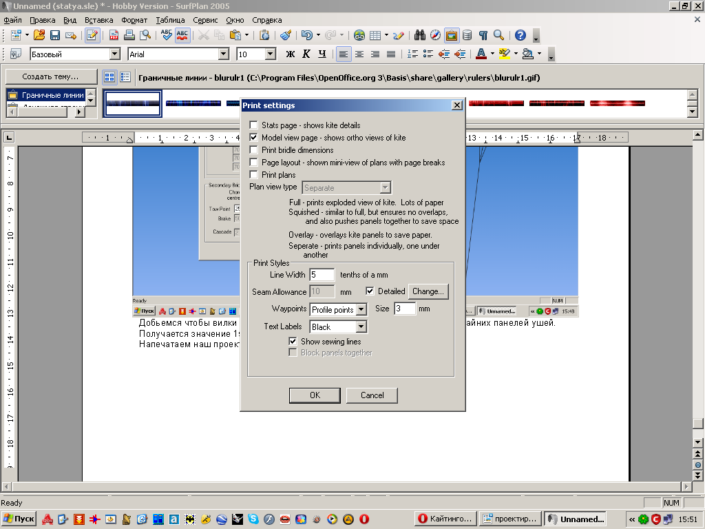 Если у нас предполагается жесткий каркас, то уши делаем параллельные(в крайнем поле значение 90), если каркас достаточно хлипок, то тогда в крайнее поле вводим значение превышающее 90, уши чуть сойдутся в сторону планки(подгонять вручную печатая, вид спереди кайта, после того, как определимся конкретно с длиной строп).