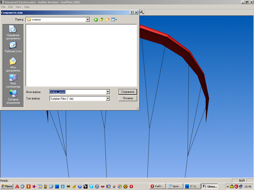 Наклоним вид кайта в программе так, чтобы смотреть на плоскость в которой лежит каркас, и добьемся настройками чтобы каркас гнулся плавно и близко к жизни. приблизительно так: