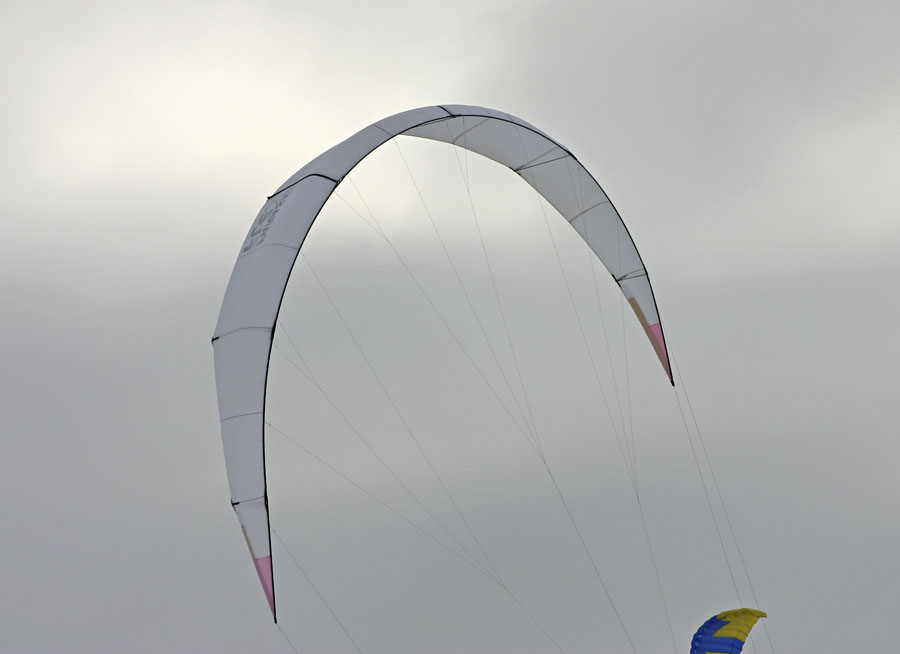 Поведение в зените также заметно отличалось. Магик выходил на угол около 70 градусов над землей и стоял там. Попытки поднять его повыше затягиванием силовой стропы ни к чему не приводили, а расслабление при таких маневрах управляющих строп вызывало медленное сваливание в сторону. Пассат же выходил на угол до 80-85 градусов, и устойчиво удерживал эту позицию. При дальнейшем затягивании силовой стропы начинал развиваться флаттер передней кромки со снижением тяги, т.е. депауэр. Если затягивание силовой стропы увеличивалось, то кайт становился практически плоским и флаттерил в воздухе, несколько отходя назад и снижаясь. Наблюдалось небольшое рысканье вокруг зенита в режиме флаттера. Управляемость снижалась в зависимости от степени флаттера и восстанавливалась небольшой натяжкой управляющих строп. Все процессы развивались активно, но вполне контролируемо в любой момент. Натяжение управляющих строп тут же восстанавливало форму купола и полный контроль над кайтом. Сильное затягивание силовой стропы практически полностью гасило тягу кайта, превращало Пассат во «флаг», который медленно опускался на край ветрового окна (фактически, это режим аварийного сброса тяги без отцепления от кайта).