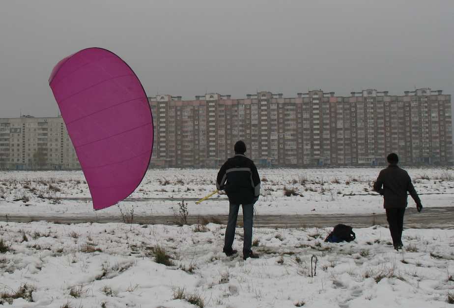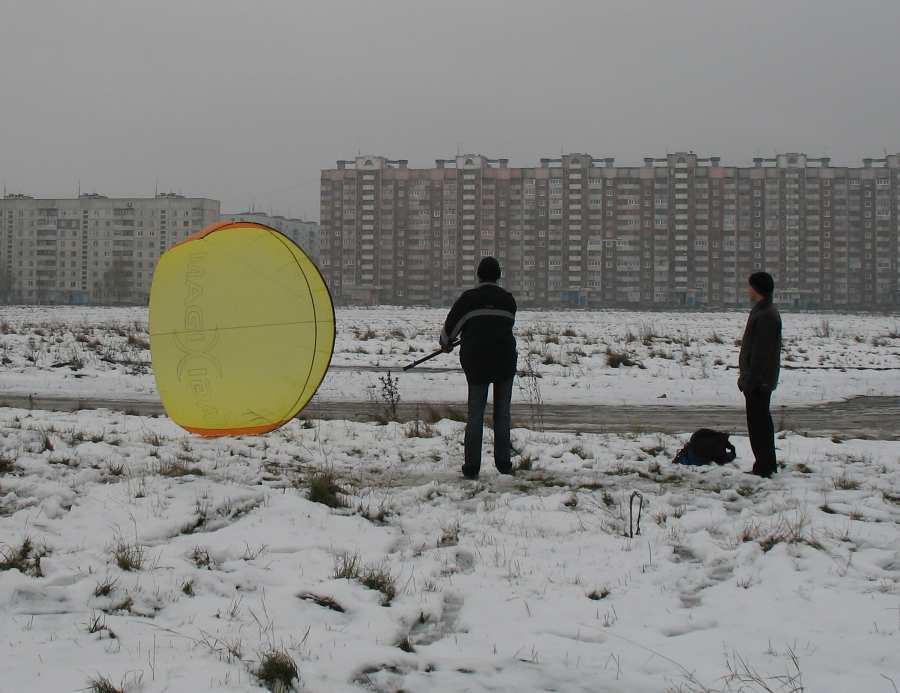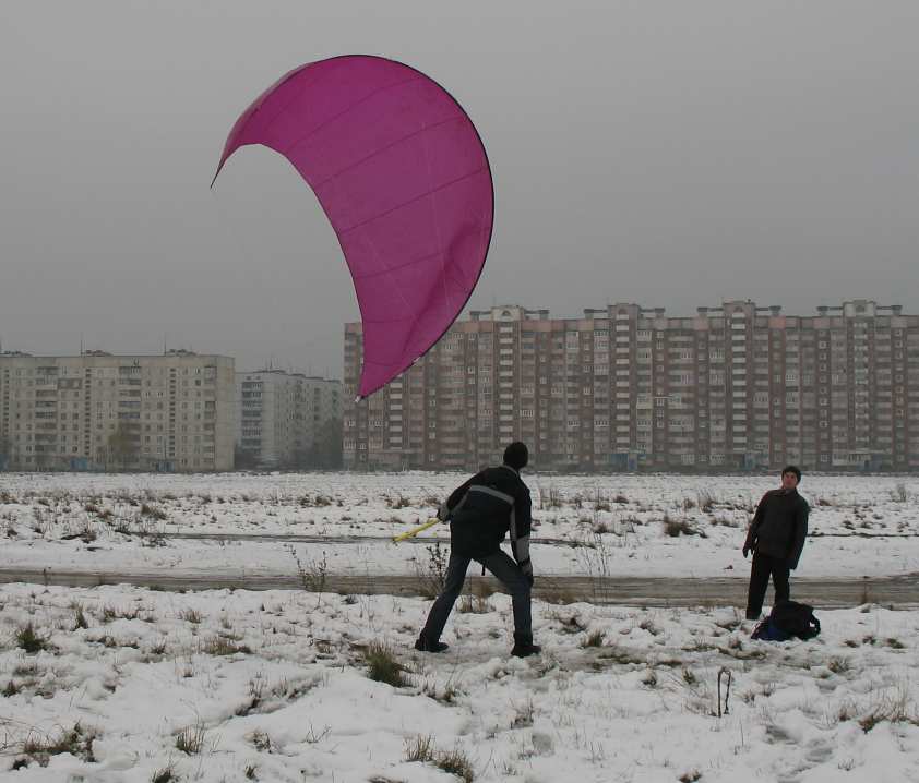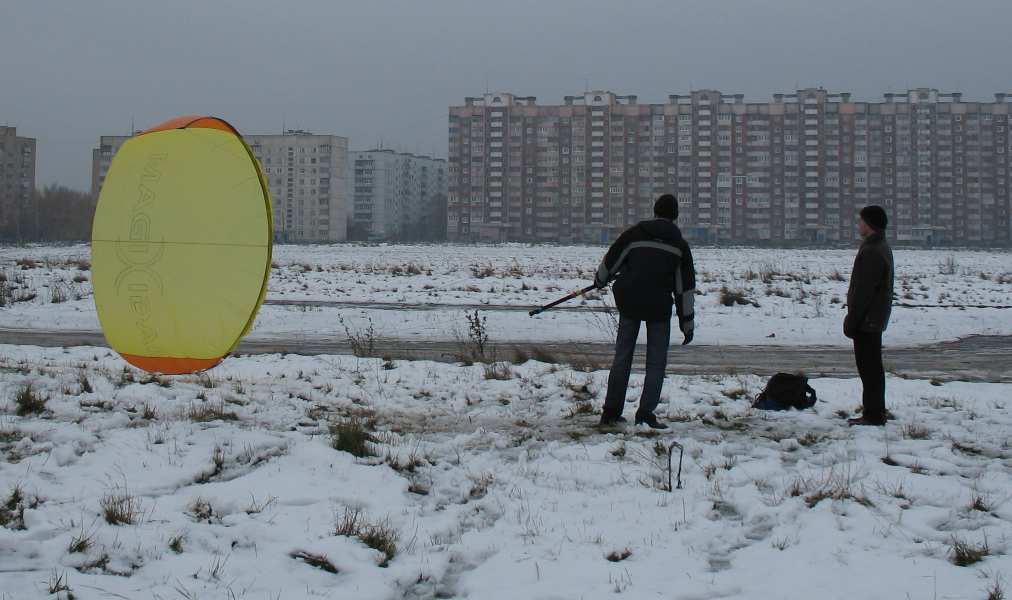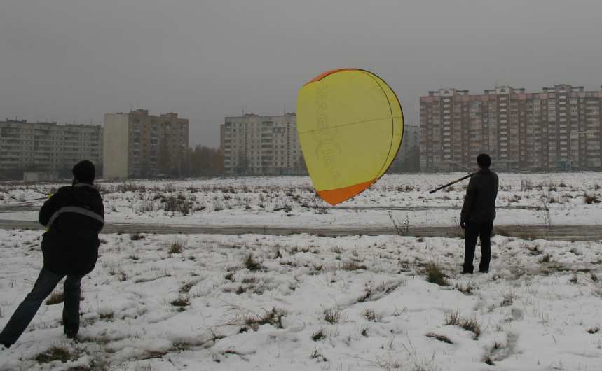 На территории г. Харькова лицом к лицу сошлись двоюродные братья по ветряным делам каркасные кайты Магик и Пассат. Встреча происходила с целью познакомиться и познакомить Вас с основными параметрами выше означенных произведений постсоветского пространства, т.е. так называемые кайт-тесты. Сразу же скажу, что провести их по полной программе не удалось из за как обычно не соответствующей идеалам погоды. В этот день было пасмурно, температура около 5 градусов тепла, под ногами интенсивно таял первый снег, создавая неудобства как для ног, так и увлажняя и утяжеляя ткань кайтов. Но ввиду того, что в кайт тесте участвовал гость из Москвы, а сама поездка планировалась заранее, то „матч состоялся при любой погоде“. Главный показатель – ветер, представлял из себя рванину со скоростью от 2 до 7 м/с с заходами до 15 градусов в ту и другую сторону от северо-западного направления.