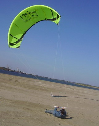 В принципе не страшно, но когда навыка управления нет, то очень вероятно, что ты кайт через центр ветрового окна начнешь проводить, а когда онт тебя тянуть начнет, ты интуитивно потянешь бар на себя, а при этом тяга увеличится еще больше - ну и полет обеспечен Что в общем у нас и получалось. Как то страховку дернуть я не успел, а может не успел подумать, хотя перед стартом я все это продумал. Но для тех кто уже катает это уже не интересно Все таки нужно начинать с кайта поменьше Ну уж какой был с такого и начали. Вот второй раз уже Skyline в песок лицом воткнулся , надо отдать должное на коротких стропах кайт упал ну и проблем было меньше, а на длинных кайт начал крутить и тащил нас вдвоем - в аккурат до берега Волги немного оставалось подоспел третий человек.