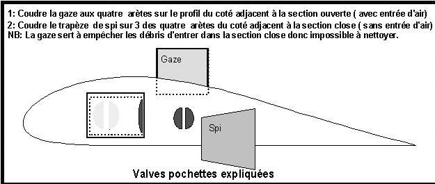 На первой фотке показан клапан в задней кромке кайта(TE, trailing edge) я бы поставил парочку где надо думать.