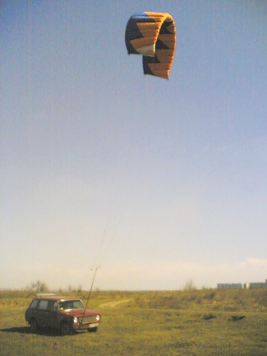 кайт довольно свободно крутит лупы на коротких(менее 10 метров) стропах.Прицепил его к авто,и кайт летал самостоятельно.Естественно,ветер порывистый,меняет направление,да и высота небольшая,поэтому кайт то и дело поворачивал в разные стороны,но держался.