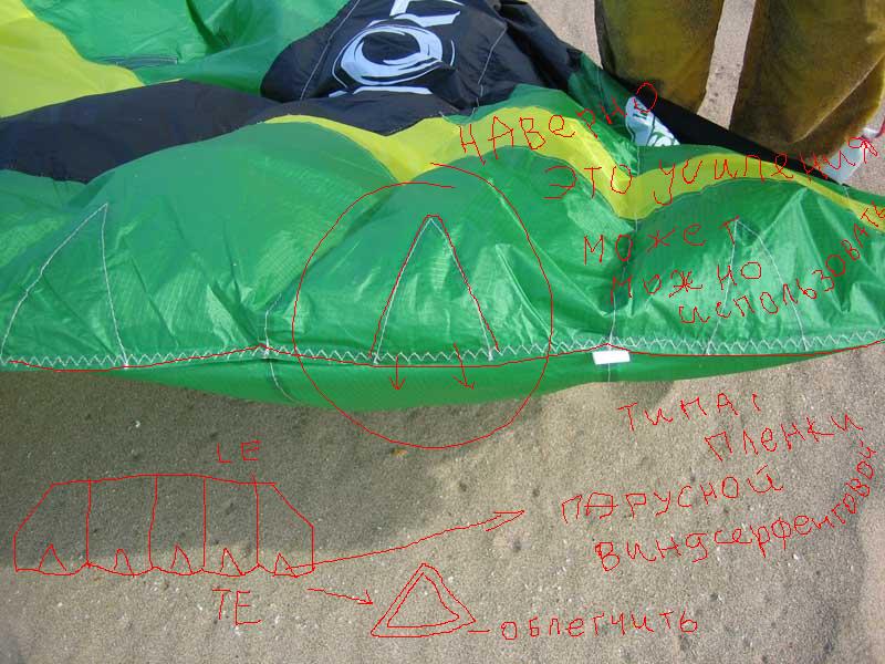 сам собираюсь сделать две задние ленты свободными. как делать - делать дырку в нервюре и пропускать через нее, или использовать веревку и пропускать ее через шов - пока не решил.
