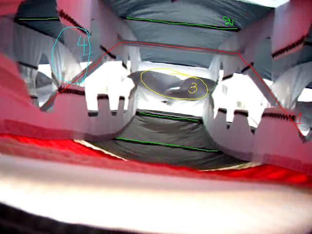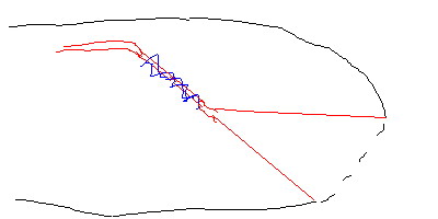 это вид сбоку. верхняя и нижняя часть клапана сострочены между собой, там где синим отмечено клапан крепится к нервюрам. соотв треугольнички по бокам тоже вшиты. другими словами - прямоугольный раструб сходящийся в два слоя, пришитый а нервюрам по бокам чтобы не выпукивался. =)