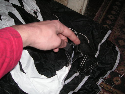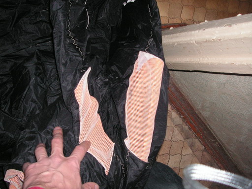 сливается через банальную дырку. ровно как и песок и всякий шлак через нее пролетает. в самом ухе ТЕ не закрыт. от самой задней кромки часть дырки закрыта липучками (по диагонали от ТЕ к месту крепления крайней стропы)