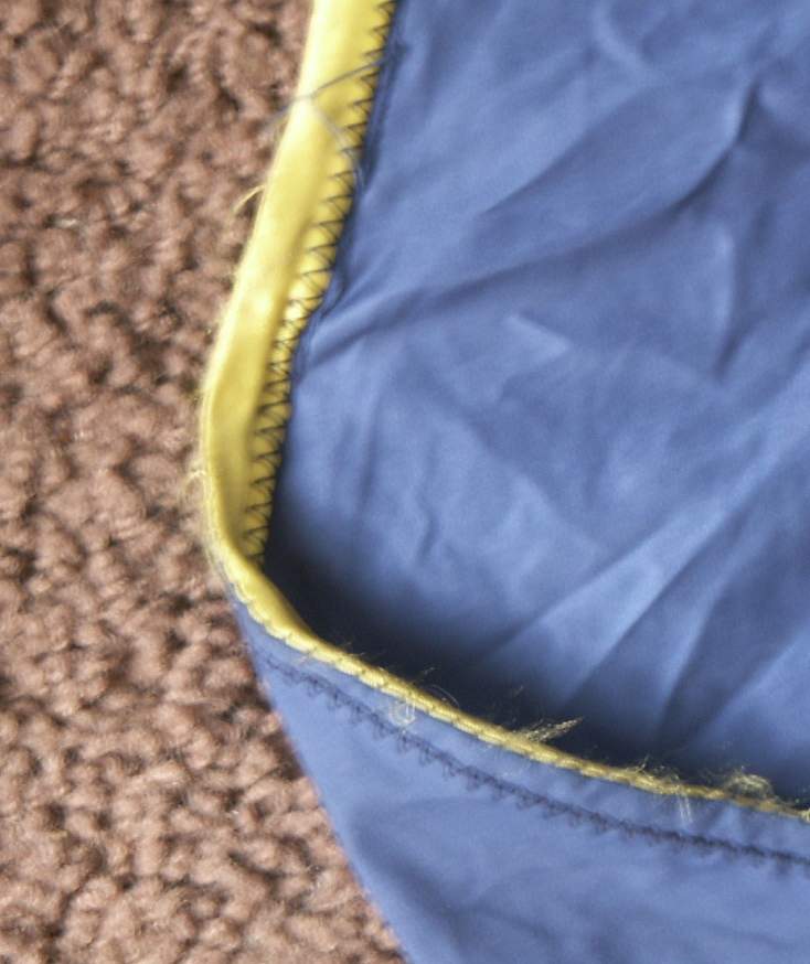 1. Шнур вшит по всему периметру и по стыку полотнишь где идет строповка (шнур - у меня был бельевой шнур, он именно вшит, т.е. пристрочен прямыой строчкой к краю полотнища);