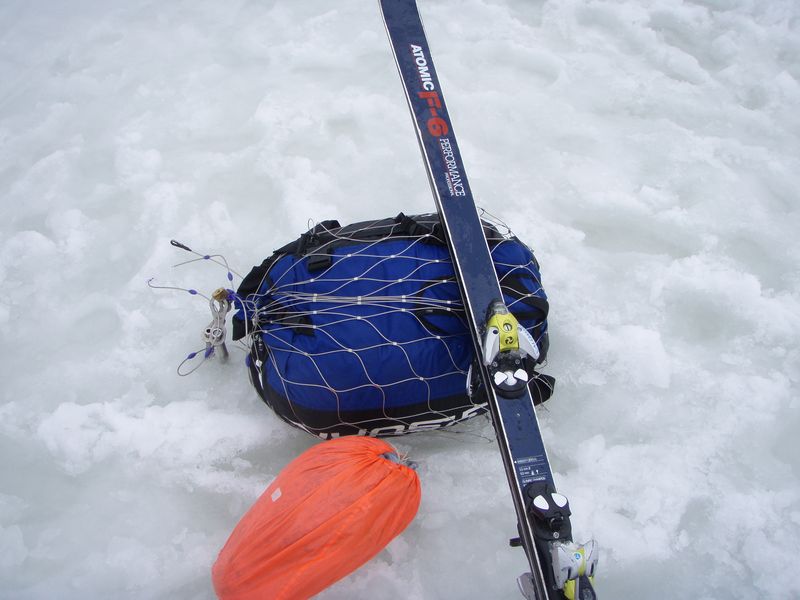 А вообче на этой фотке способ стартовать со льда, когда кайт придавить/присыпать нечем. Вкручивается альпиндяйский ледобур, за него цепляются задние стропы, а только затем раскладывается кайт и тоже сначала цепляются задние. В результате он сразу садится в креслице. Если конечно задняя кромка удачно сделана