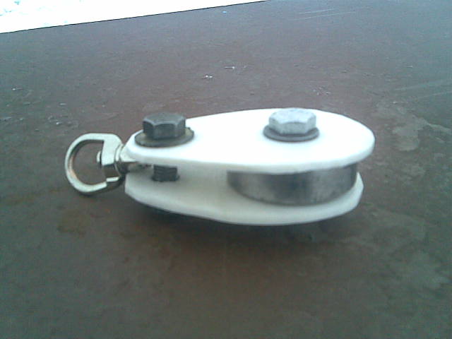 Предлогаю вариант самодельного изготовления блочка.В качестве самого ролика использовал подшипник закрытого типа,две фторопластовые пластины,два болта М8 с шайбами и магазинный вертлюг.Изготаливал из подручных материалов,можно сказать на колене и из того,что было,поэтому такого большого диаметра болты.да и сам подшипник наружный диаметр имеет около 35мм.Сегодня параллельно с испытанием панш 7ка,испытал и этот блочек.в общем работает хорошо,усилие,при перемещений ручек,практически отсутствует.В перспективе еще сделать,но из более маленького подшиппика