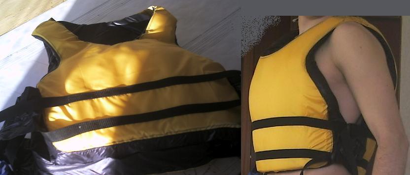 таким образом надо располагать плавучии элементы в основном на груди и вокруг шеи.если и делать вставки на спине то какие нибудь тонкие противо ударные.мне кажется наполнение можно делать из туристических ковриков вспенненный полиуретан достаточно прочнй мягкий и плавучий.верхнюю шкуру шкуру сшить из яркой балонии ,на подкладку пустить сетку типа от тренировочных штанов чтобы вода вытекала.