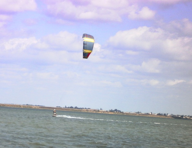 Ветер ровный вдоль берега,метров восемь. Короче,встал на досу,и поехал.... Чесно говоря ,офигел сам...думал пол-дня буду бултыхаться,пока начну уверенно стартовать,тем более меня волновало движение "неудобной ногой" вперед .Оказывается абсолютно пофиг в какую сторону ехать.Просто трамваил туда-сюда,тащился от катания.Причем заметил,что в процессе движения внимание не уделялось ни кайту ни доске,а просто смотрел куда надо ехеть,какая стойка,как "кренить" доску.Естественно вырезаться сразу против верта у меня не получалось,но я чесно говоря такую задачу сразу и не ставил,но и чтоб безбожно сливаться,такого тоже небыло. Меня на первых порах интересовало,взаимное положение кайта,доски,тяги,скорости... На лимане новичкам кататься оч просто.Едишь в одну сторону,остановился(если умеешь ) ,стоишь по пояс в воде,повернулся и поехал в другую. Потом сразу стал пробовать делать повороты.Да бывало падал,бывало ронял кайт,бывало опускался в воду,но до обеда уже мог полне нормально разворачиваться разными способами.