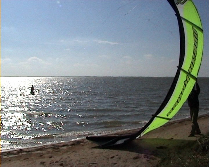 Один из недостатков кайта,обернулся некоторым достоинством.Дело в чем,когда катаюсь на месном водоеме,то меня бесит пляжный песок.Липнет он сабака,к куполу.Нужно ждать,пока высохнет,чтоб струсить перед упаковкой. А тут в сырую погоду. прицепил кайт за пятую стропу,он взлетел вверх рогами (а это его недостаток при рестарте с воды).И висит себе над землей сохнет....