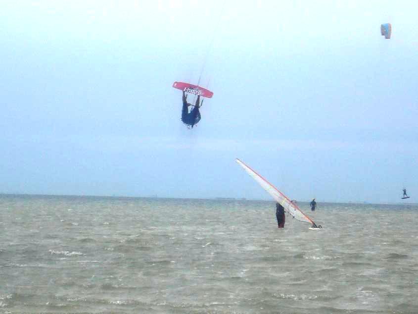 ... Потом стало раздувать сильнее.Поднялся небольшой чеп,я взял доску "с арлекином". Сразу почувствовалась разница в досках ,едит совсем по-другому. Не хуже,не лучше,а именно по-другому.Где -то к часу дня раздуло так,что с висящим в зените кайтом,я не то чтоб сделать шаг назад не мог,а меня приподнимало и сносило,причем мой старый фьюел,С-шка,был собственноручно оборудован пятой стропой. Без нее,я вааще не представляю как бы катал.. Вообщем,кайтеры на С-шках стали сворачиваться,остались только те,кто с гибридами. Да и то,настраивали так на минимальную тягу,что у висящего кайта,почти весь купол трепыхался,и кайты чуть ли не" носом клевать" начинали ,от сброса тяги. Потом нашли тучи,пошел бешеный ливень,стала гриметь гроза,катеры все свалили,остались виндсерферы. Я тоже взял виндсерв....