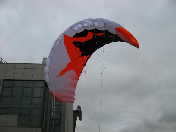 За отсутствием управляющих строп и бОльшей части уздечки сопротивление будет поменьше. И угол атаки, очевидно, небольшой. Так что резво должен летать. Правда, за голову, возможно, заскакивать станет.