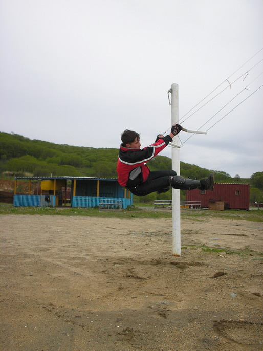 Это сколько же бесшабашности нужно иметь, чтобы прыгать среди тросов, столбов, столбиков, пляжных грибков, бочек, машин и людей... А мы удивляемся, как человек привязал себя к столбу и к кайту одновременно. Круче, наверное, только катание на волнах от ядерных взрывов...