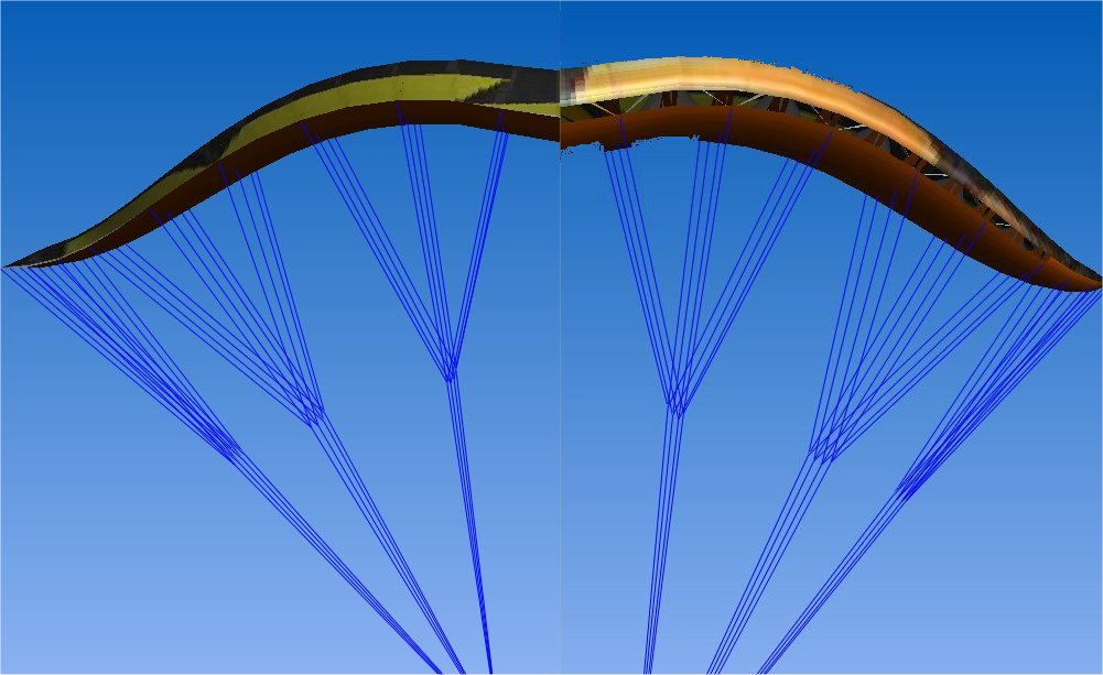 Что мы имеем в схеме птица. Два почти-полуэллипса, натяжение 4/5 задней кромки аналогично классической схеме, на ушах натяжение ослаблено и формируется в основном наддувом, уши могут "шевелиться" и подстраиваться под сходящий вихрь. Индуктивное сопротивление уменьшается, есть резерв, можно увеличить толщину профиля (если есть желание ).