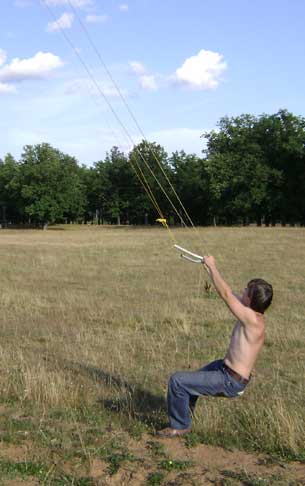 Испытал ручки и новые рулевые стропы (Для них использовал динамическую веревку производства Дзержинск 2 мм на 120 кг) Правда на месте немного пришлось повозиться с настройкой длинны строп, но вот потом все вреде и получилось. Взлетает, рулится и тянет на ура! Хотя конечно сравнивать было и не с чем но все же тяга такая, что удержать кайт в руках очень тяжело. Поле десяти минут управления и маневрирования руки просто отваливаются. Наверное стоит сделать блок на ручки.