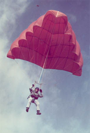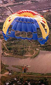 Интересный парашют. 27 м,вес 4,3кг вертикальная скорость 5,65 горизонтальная 6,5. качество планирования 1,16.
