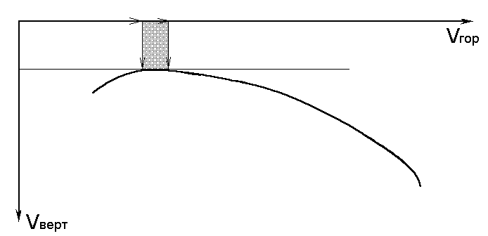 Режим минимального снижения определяется аналогично - проводится горизонтальная касательная к поляре. Ввиду того, что поляра в верхней своей части достаточно полога, то затруднительно определить конкретную точку (в этом вообще-то нет необходимости), в результате получаем, что скорости минимального снижения соответствует набор горизонтальных скоростей. То есть - вертикальной скорости, на которой аппарат снижается меньше всего, соответствует некоторый промежуток горизонтальных скоростей. Получается, что на этом режиме можно в узком диапазоне изменять общую скорость без изменения вертикальной составляющей. На практике - немного задавленные триммера, поджатые клеванты. Именно здесь, при обработке слабых потоков, в первую очередь проявляется опыт пилота и его знание конкретного купола.