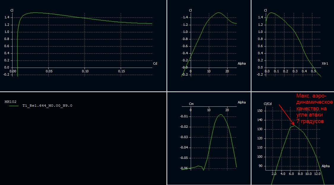 Что касается проекта, то попробовал посчитать. Правда, на скорую руку, точность может быть невысокой, лучше перепроверьте. Профиль экспортировал из проекта, вот результаты продувки в Xfoil для скорости полета 12 м/с (43.2 км/час). Впрочем, на других полетных скоростях картина будет аналогична, тут важен порядок цифр.
