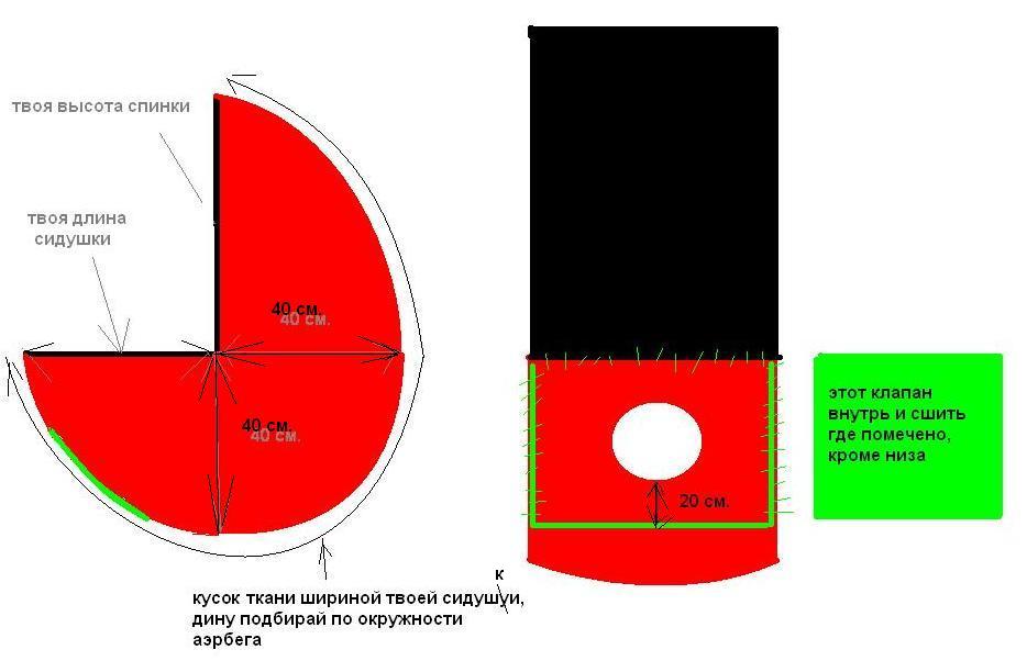 наверно будет смешно, но делалось все на коленке(т.е снимался размер сидушки, спинки и растояние на раздутие 40 см., по краям округлил на глаз, рисунок ниже), отверстие сделал приложив тарелку к предпологаемому месту наибольшего обдутия, сработало с первого раза,на все ушло пару часов, 3 погонных метра таффеты, делал в 2 слоя пропитками внутри, шов зигзаг посередины двух прямых , но такой аэрбег делался под определенную подвеску, там сидушка короткая, так что под мою новою не подошел, но это можно сделать другую аэрбег
