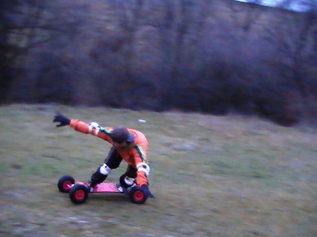 ...вчера провел тесты МБ,на склоне.Учился катаца.Что можно сказать... страшно... на вершину так и не решился поднятся,катались с середины.Устоять вполне возможно(если совсем большую скорость не набирать).Радует проходимость снаряда,спасиб большим колесам и гибкой деке.К примеру,литишь с горы,видно бугор,или яму,сразу мелькает мысль,щас пипец..,но нет прохавывает нефиг делать...Под конец каталки,когда смелости прибавилось,во время спуска одна мысль тревожила,как бы че ненавернулось....