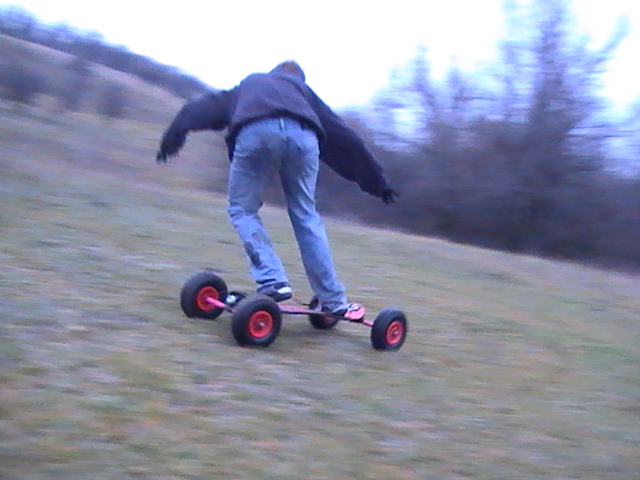 ...вчера провел тесты МБ,на склоне.Учился катаца.Что можно сказать... страшно... на вершину так и не решился поднятся,катались с середины.Устоять вполне возможно(если совсем большую скорость не набирать).Радует проходимость снаряда,спасиб большим колесам и гибкой деке.К примеру,литишь с горы,видно бугор,или яму,сразу мелькает мысль,щас пипец..,но нет прохавывает нефиг делать...Под конец каталки,когда смелости прибавилось,во время спуска одна мысль тревожила,как бы че ненавернулось....