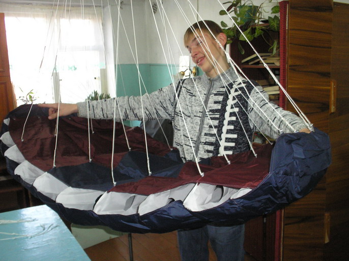 Но перед этим тренировались целую неделю-имитация раскрытий ,укладка ,груза -различные по массе,и всякие эксперименты по управлению-добились опимального уровня,когда модель начинает в полете поварачивать в одну строну,тоесть нарезает окружности