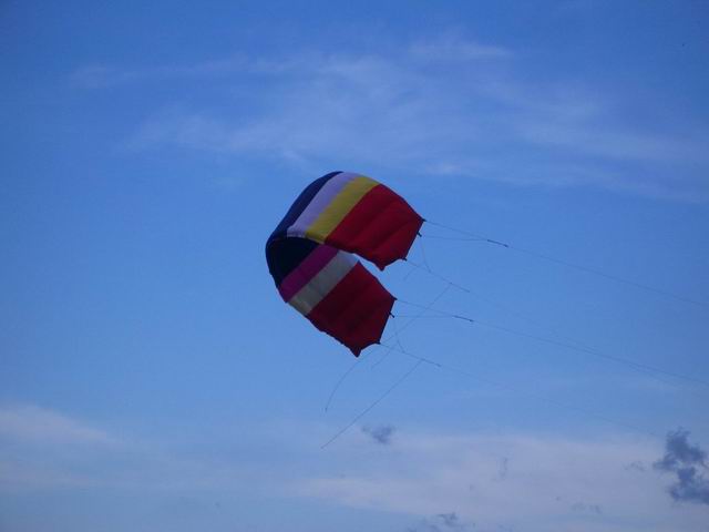 Что касается первого запуска,ветра думаю в 4 - 5 метров маловато для выводов,тем более рванина. Заднюю кромку нужно усиливать.Прошей ленту,или стропу,чтоб не тянулось.Еще по фото видно,что купол в районе задней кромки пузырится.Такое впечатление,что хвосты нервюр подрезаны и все.Там необходима сетка,чтоб предотвратить это раздувание. Также нужно подтянуть и отрегулировать поводок на ушах,а то видно,что провисает и практически неработает.