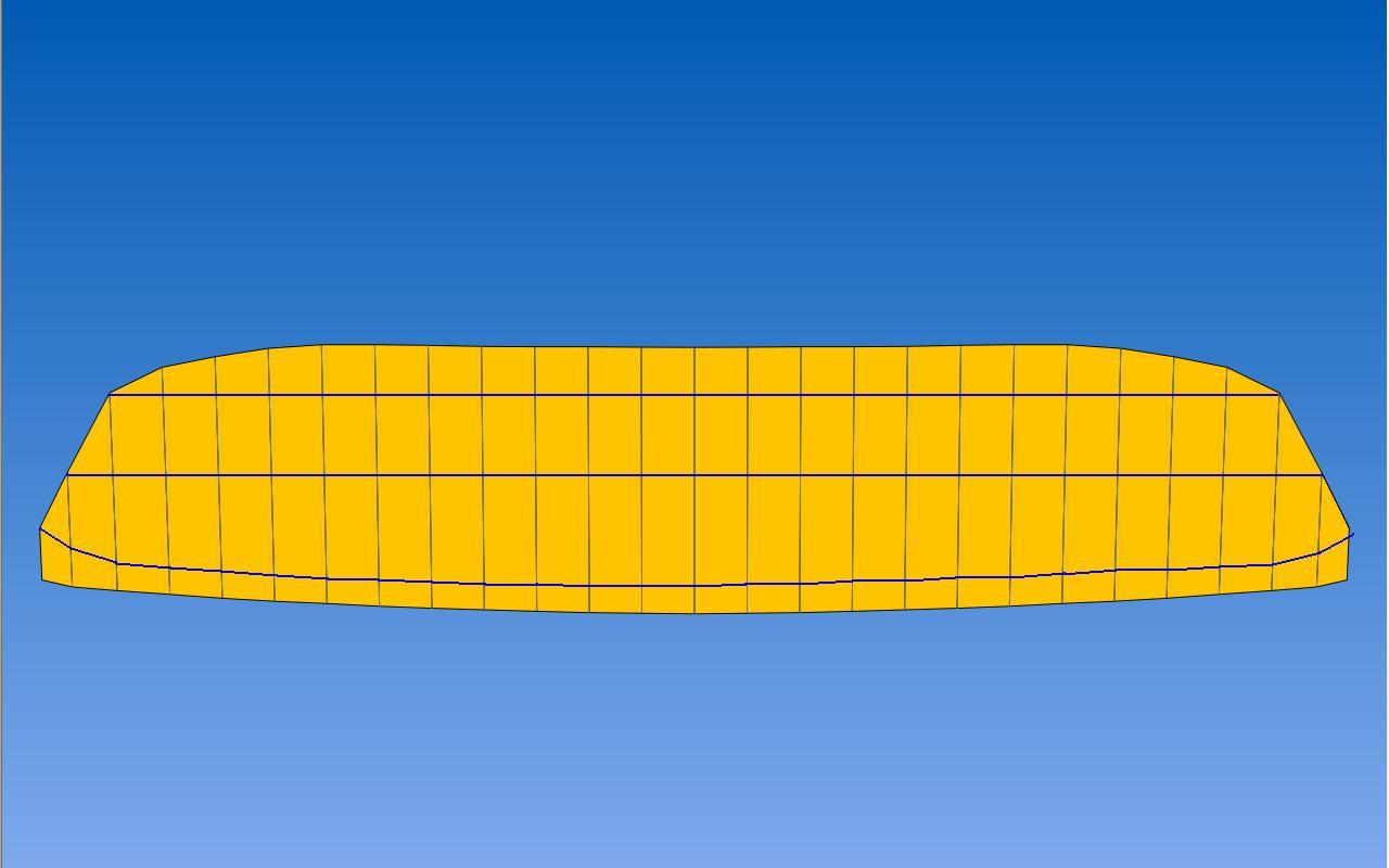 Здесь ленты я обычно пришиваю в местах соединения панелей с нервюрами.Шить их можно,или одновременно с шитьем панелей,или отдельно пришивать,или в момент шитья нервюр,как угодно.Длинна участков лент равна ширине панелей в том же месте,т.е. без натяжений и провисаний.Первые две ленты шьются над нижними,т.е. перпендикуляры на рибах откладываем как вниз на дугу,так и вверх.Задняя лента,пришивается на растоянии от задней кромке равному А , гда А равно 10% от максимальной хорды.В этом размере кайта получается,что задняя лента пришивается на расстоянии 19 см от задней кромке.На ушах плавно закругляем к углу.