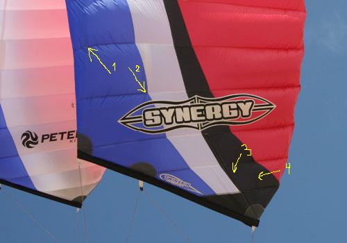 1- передняя силовая лента,2- задняя силовая, 3- косая задняя лента управления и 4- на фото кайта на дядипетином сайте,лента проходящая через отверстия в середине нервюры( в хвостовой части) причем хвостовики нервюр из сетки.