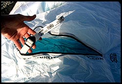 один конец пришит через усиление на пенель,второй- свободный.Ленты будут прорходить через отверстия в нервюрах . При регулировке кайта ,концы лент будут свободно проходить через законцовки.Потом будет установлен необходимый преднатяг ,и ленты зафиксирую окончательно.