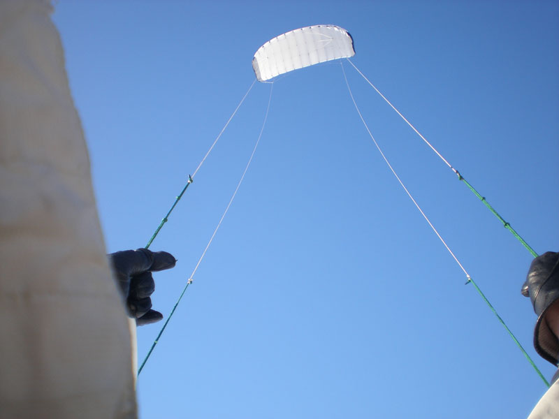 Пробовал его в варианте с ручками, летает хорошо, но кататься не удалось по причине отсутствия доски. Потом переделал на планку, но планка не обычная, подобная схема была уже здесь. Силовые стропы крепились к блочкам, а стропы от клевант в самой планке. Получалось при перекосе планки задняя кромка подгиналась вместе с переломом крыла. Но при затягивании планки к себе клевантные стропы тянуться больше, чем силовые через блок. Крыло при этом могло заваливться. В качестве силовых строп использовал все теже списанные стропы от параплана, соединенные между собой петельками. Получилась своеобразная цепь. Но первые испытания показали, что нагрузки стропы не держат, постоянно рвались. Тогла я их сложил пополам, укоротив в два раза. Попытался так покататься на борде. При даче нгрузки стропы развалились нахрен, силовые, те что на кайте в порядке. Собственно после этого как-то охота сразу пропала.