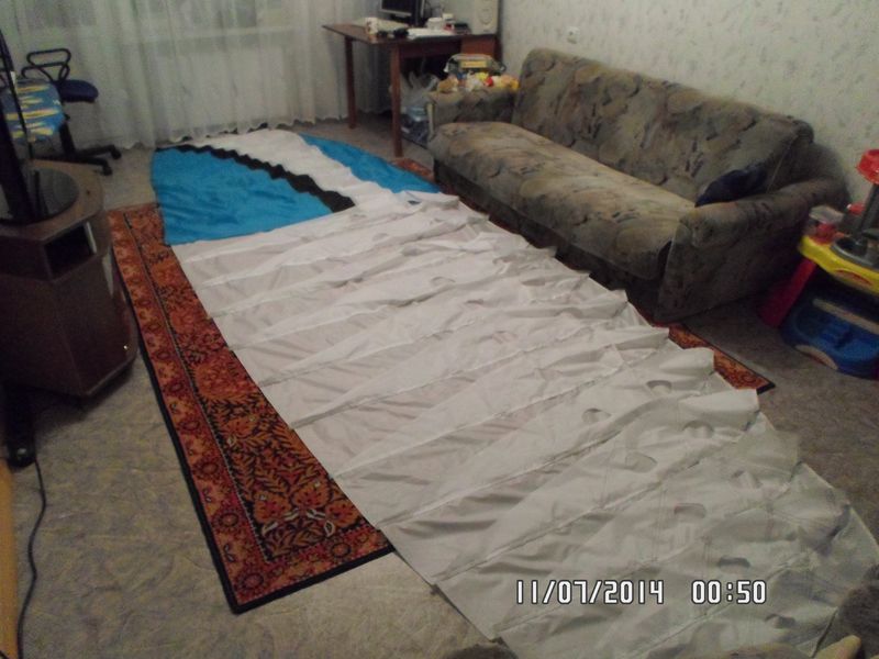 рисунок я приглядел с какого то спидика. в инете на фотки наткнулся и уж больно он мне по душе стал. заднюю кромку прошил вчера. сегодня сколько успею поделаю стропы. может в выходные на огороде попробую поднять бомбардировщик этот.
