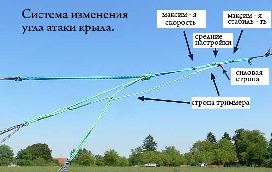 Начнем с того, что в сильный передозный ветер, триммер затянут полностью,но если силовые стропы прицеплены на средние узлы, то все в порядке. Достаточно перевязать на крайние, уже висящий в зените кайт при отпущенной планке пожет даже приподнимать,хотя управляющие практически висят свободно, а напряжены только набегающим потоком ветра.. А что касается триммера, то здесь такая заморочка. Если взять минимальный ветер когда можно катать на сноуборде на хорошем покрытии, то триммер как нестранно, распускать нельзя. У кайта не будет скорости.Доходит до того, что кайт может по центру окна лежать на задней кромке, никуда не взлетать и не тянуть.Если дернуть его за силовые стропы, он взлетит, резко наберет скорость и этого достаточно, чтоб пару раз махнув, ехать в любом(разумном) направлении. Если же по логике распустить тримммер, то скорость набрать не получится и тяги не будет.