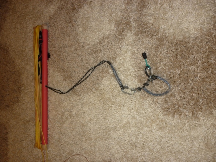 Планка отличная. Делал такую же из велоруля прямого. Одно замечание. Прусик при подмерзании влажной веревки может проскальзывать. Поэтому я поставил щелевой зажим - кламклит. Стоит он недорого, работает отлично. Вместо карабина выше триммера привязал звено нержавеющей цепи. Колечки из нержавейки почему-то стоят дорого, а вот звенья цепи прекрасно их заменяют и стоят копейки.