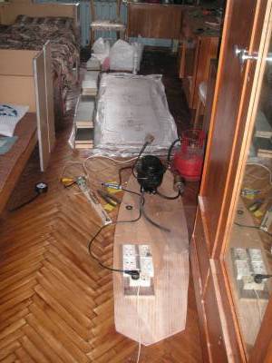 ... набор,как и в этой,пенопласт,шпон.Потом нужна деревяная ворма для формования рокера и конкейва.Будет представлять собой фанерные боковины,соединенные брусками,которые создадут рокер.Сверху будет прикручен лист пластика,который будет отпечатывать днище доски.Вот собственно и все. Набирается из стеклопластика ,шпона и пенопласта борд,сверху полиетилен и вакуум.Полиэтилен по-периметру герметиком приклеивается к пластику.Останется подумать как проще сделать кромки .