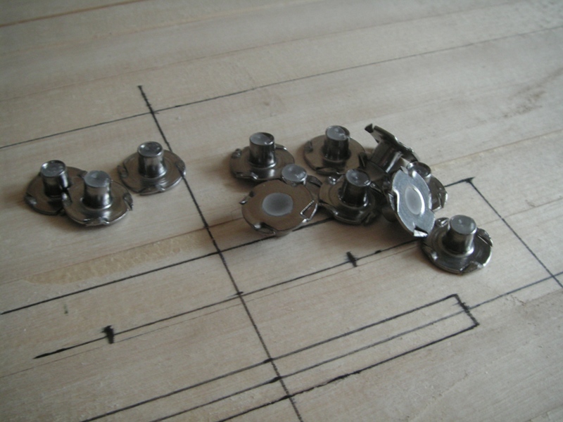 Закладные делаю из мебельных гаек. острые зубья загибаю плоскогубцами. внутрь заливаю парафин. осталось просверлить сердечние и выфрезеровать/вырезать место в дне под основание закладной. гайки готовы к вклейке. внутри стандартная м6.