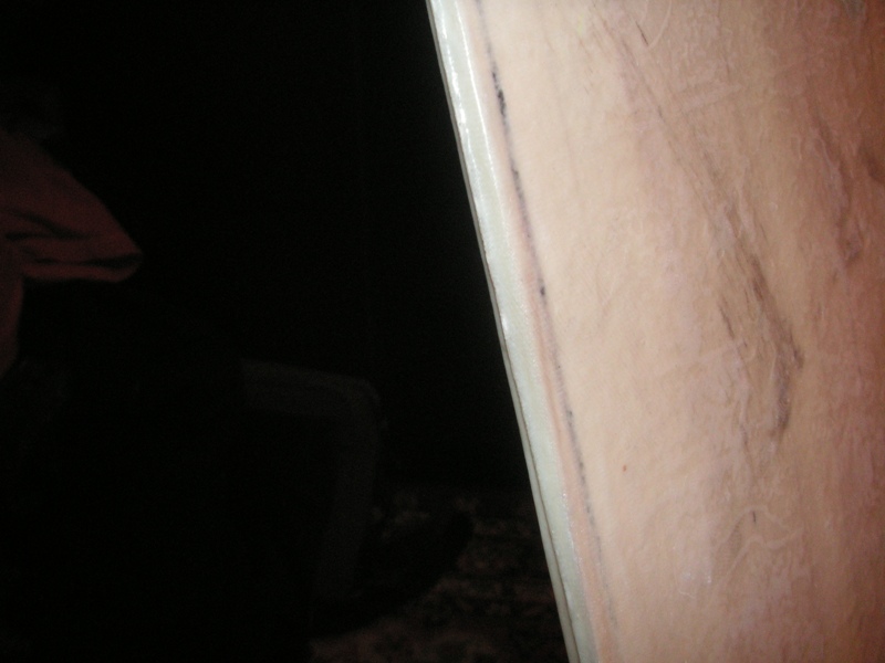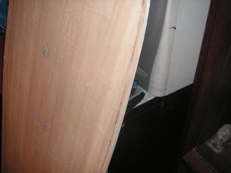 сердечник сделан по проверенной технологии "осиновый штакетник" - в строительном покупаются осиновые полки и распускаются на рейки 1,5 см шириной. потом все рейки кладуться на ровный пол и склеиваются ( я пользую клей "титан"), потом это все обрезается лобзиком. толщина (всякие там утончения на краях и прочее 3д) доводится электрорубанком. размечаем дырки под закладные и в итоге получаем такую штуку: