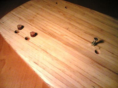 Вообщем закладные.Если плавники делать несъемные,то можно думаю просто прикрутить,и резьбу проклеить.Если съемные,то нужно позаботиться,чтоб вода внутрь не попадала.Можно трубочки вклеить,можно рассверлить отверстие и залить пластиком,смолой.Я решил вклеить вставки вырезанные из текстолитового стержня.