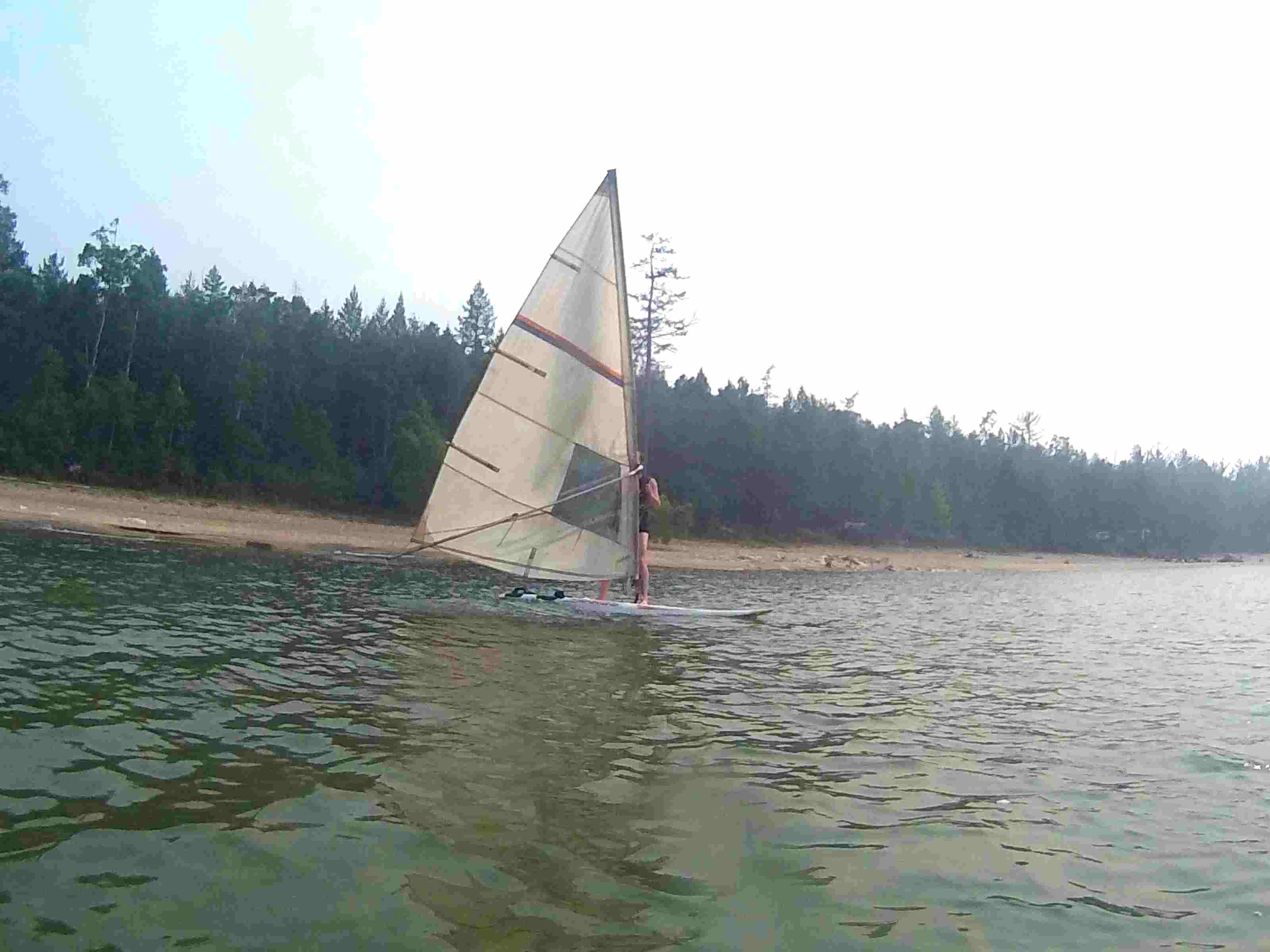 4. взобраться на доску, став так, чтобы ветер дул в спину и медленно и спокойно вывести парус из воды за старт-шкот, при этом доска должна оставаться строго поперек ветра, мачта между ногами. передняя нога ближе к мачте со стороны носа. постоять и приспособиться Мачта слегка отклонена от себя и смотрится как флюгер, стараться деражать все так, чтобы парус стоял строго по ветру, а доска строго поперек ветра.