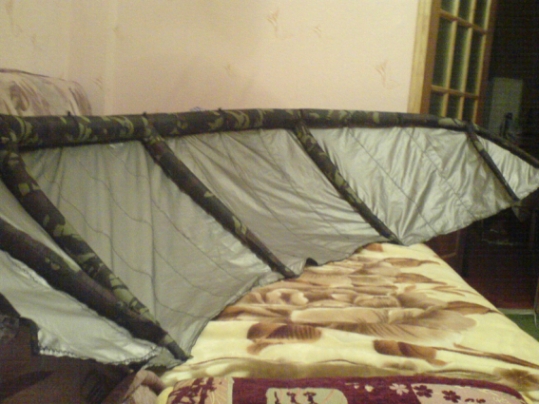 сколько материала пошло на пошив , я буду делать примерно такой-же по плошади. Я тут читал что ты пропитывал ткань (лаком с клеем) думаю какой материал взять , взять подкладку и пропитать а будет ли она достаточно прочной или взять материал уже слегка пропитанный и пропитать выше указаннным составом но не станит ли он слишком тяжолым. Что посоветуеш Smile