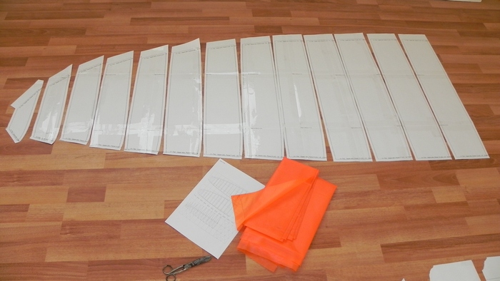 Берём верхний и нижний скин одной секции, накладываем их друг на друга лицевой стороной и прошиваем по передней кромке. Далее всё то же самое проделываем с остальными закрытыми секциями. Затем стыкуем первую секцию со второй(можно зафиксировать иголками), приклыдываем нервюру и начинаем все получившиеся три куска ткани сшивать. Не забываем про петельки для строп. Далее собираем низ. Сшиваем нижние панели друг с другом пристрачивая к ним нервюры и вставляя петельки. Лепим это к одному уху. Далее начинаем закрывать верхом. Накладываем лицевой стороной друг на друга две верхние панели, фиксируем иголками(прищепками)и пришиваем это к нервюре. И так до конца.