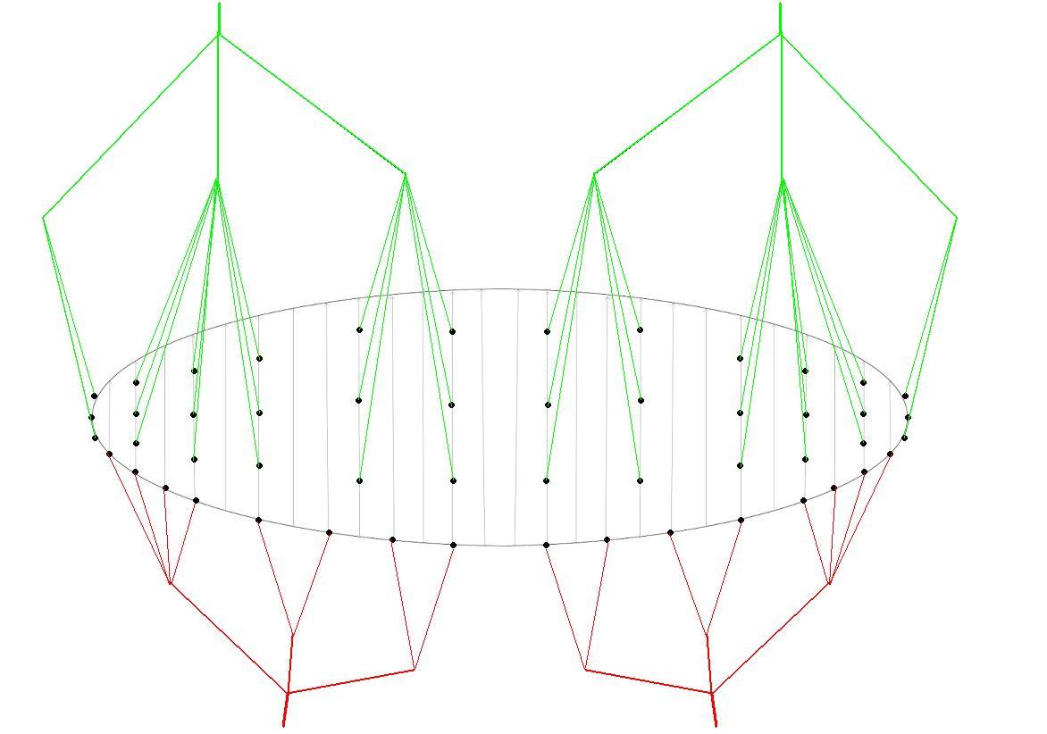Эти пучки соединяем с изготовленными стропами 2-го уровня. Должно получится 3 больших пучка, А вместе с В, С, D.