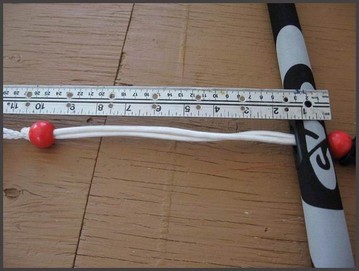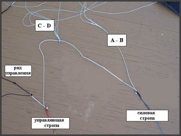 В 48.5см от точки присоединения рядов «А+В» на верёвке (153.5см) вяжется узел «восьмёрка». За него будет в дальнейшем цепляться основная стропа, идущая к центру планки.