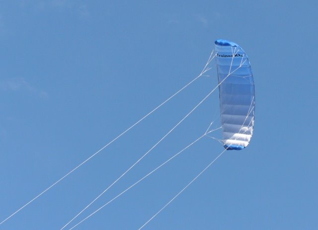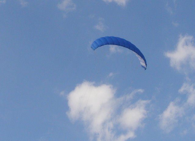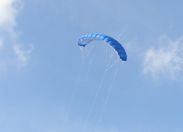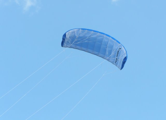 На данный момент, у этого кайта налёт около 8...10 часов. На синей стороне, пыль и грязь незаметна, если они и есть, а белая сторона по прежнему чистенькая. А вот белые силовые стропы уже приобрели серо-зелёный оттенок.