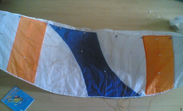 длина по верхней кромке 2000мм, ширина по центру 630мм, край крыла 260мм. количество карманов под воздух 18 , форма крыла парафойл , раньше я за ним катался на скейте по парковке , сейчас хочу настроить и снова катать , помогите совет ом или инструкцией как возродить сие чудо .