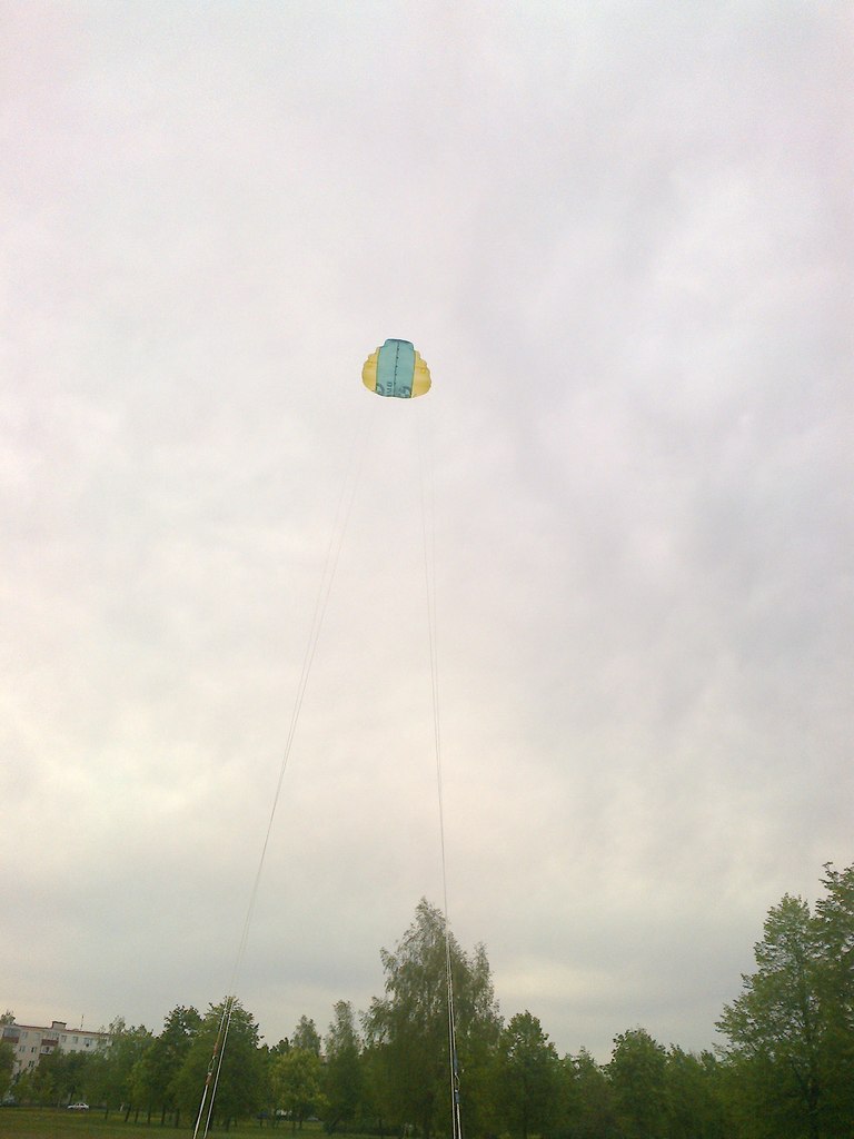 Есть ещё один важный момент! Решил собрать экспериментальную модель бескаркасного пилотажного кайта.Купол формы дельты с удлинением-1:2,5.Нос сделал как у кайта Наса на 4ёх-Т-стропах,но стропы идут только лишь по боковым панелям крыльев,их всего12шт! 8шт(силовые)идут к верхним коцам ручек,4шт-идут к низу ручек!Испытания показали потрясающий результат:Очень послушен,чуствителен к малейшему изменению управления---чудо летает вообще без всяких центральных по хорде строп!Много можно ещё продолжить---но думаю достаточно! Сколько не копался в интернете и на зарубежных сайтах........такого кайта по-типу дельта-стрела нигде не встречал!!! Вот несколько фото: